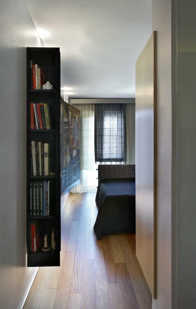 Aproveitar espaços, principalmente em apartamentos pequenos, é uma maestria na decoração de interiores. Neste quarto de casal. A estrutura da pintura abstrata na parede lateral se tornou mais um apoio funcional para livros e peças decorativos. O cantinho, por trás da testeira da cama, transforma-se numa área de leitura. O roupeiro em madeira clara encontra-se suspenso do chão e a sua geometria dão uma nova conotação ao roupeiro no espaço do quarto. Note que na entrada do quarto, nichos formam uma biblioteca incrível, que acaba por servir como uma moldura na entrada do quarto. Inspirador!